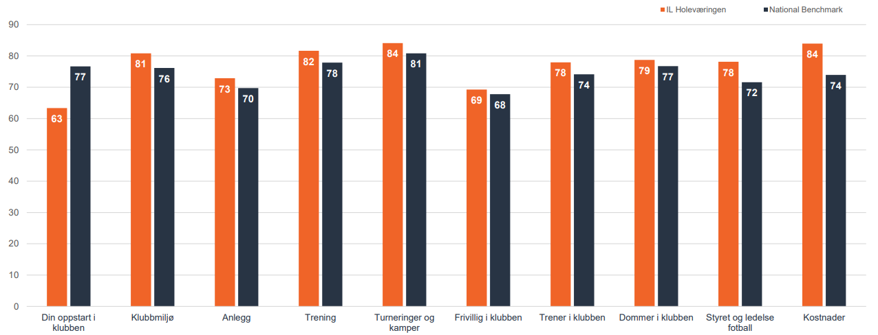 Gjennomsnittlig score på «alle serviceområder» i klubben, sammenlignet med nasjonale tall. Med unntak av «Din oppstart i klubben» scorer IL Holeværingen over nasjonalt gjennomsnitt.